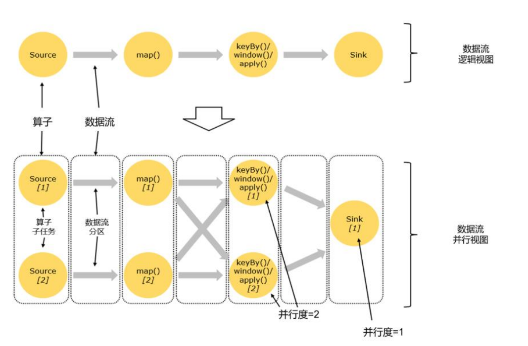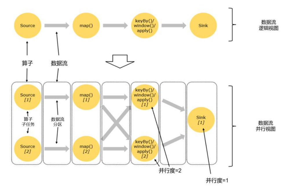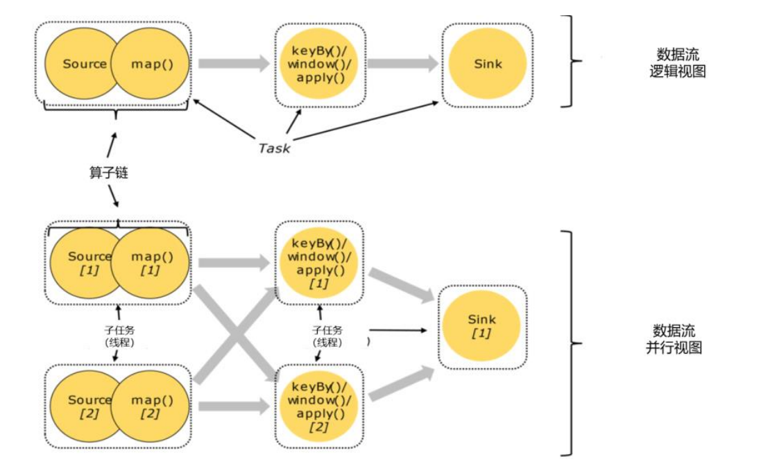 一个特定算子的子任务(subtask)的个数被称之为其并行度(parallelism)。这样,包含并行子任务的数据流,就是并行数据流,它需要多个分区(stream partition)来分配并行任务。一般情况下,一个流程序的并行度,可以认为就是其所有算子中最大的并行度。一个程序中,不同的算子可能具有不同的并行度。