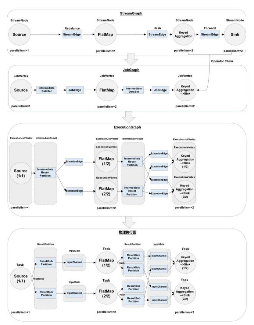- 从图中可以看到,与JobGraph最大的区别就是按照并行度对并行子任务进行了拆分,并明确了任务间数据传输的方式。