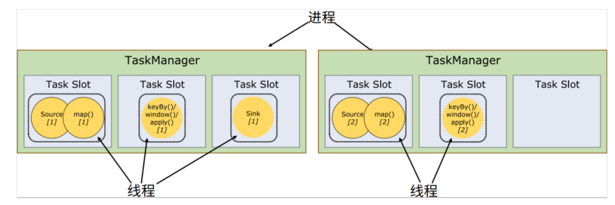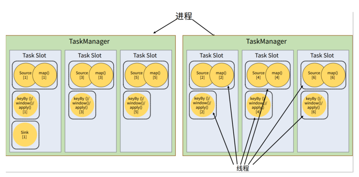 之前已经提到过,Flink中每一个worker(也就是TaskManager)都是一个JVM进程,它可以启动多个独立的线程,来并行执行多个子任务(subtask)。所以如果想要执行5个任务,并不一定非要5个 TaskManager,我们可以让TaskManager多线程执行任务。如果可以同时运行5个线程,那么只要一个TaskManager就可以满足我们之前程序的运行需求了。