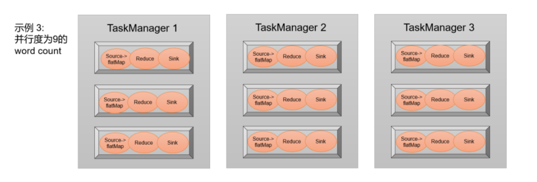 下面再举一个具体的例子。假设一共有3个TaskManager,每一个TaskManager中的slot数量设置为3个,那么一共有9个task slot,如图所示,表示集群最多能并行执行9个任务。而我们定义WordCount程序的处理操作是四个转换算子:source→ flatMap→ reduce→ sink。当所有算子并行度相同时,容易看出source和flatMap可以合并算子链,于是最终有三个任务节点。