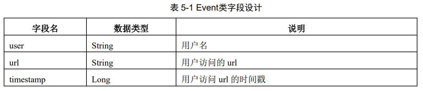 为了更好地理解,我们先构建一个实际应用场景。比如网站的访问操作,可以抽象成一个三元组(用户名,用户访问的url,用户访问url的时间戳),所以在这里,我们可以创建一个类Event,将用户行为包装成它的一个对象。Event包含了以下一些字段,如表所示: