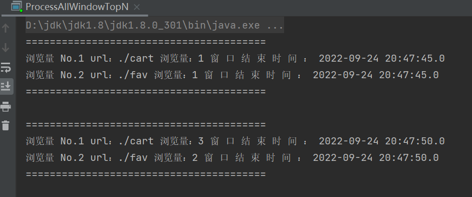 - 代码中,我们还利用了定时器的特性:针对同一key、同一时间戳会进行去重。所以对于同一个窗口而言,我们接到统计结果数据后设定的windowEnd + 1的定时器都是一样的,最终只会触发一次计算。而对于不同的key(这里key是windowEnd),定时器和状态都是独立的,所以我们也不用担心不同窗口间数据的干扰。