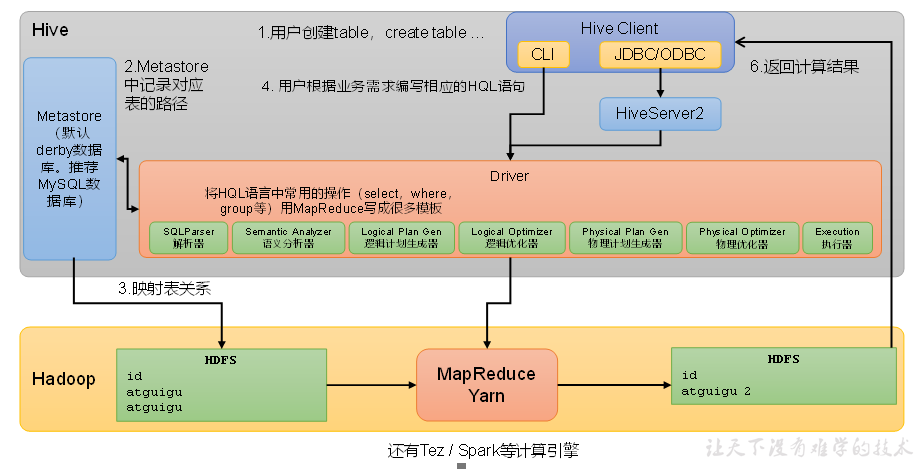 - Hive分析数据底层的实现是MapReduce(也可配置为Spark或者Tez)。