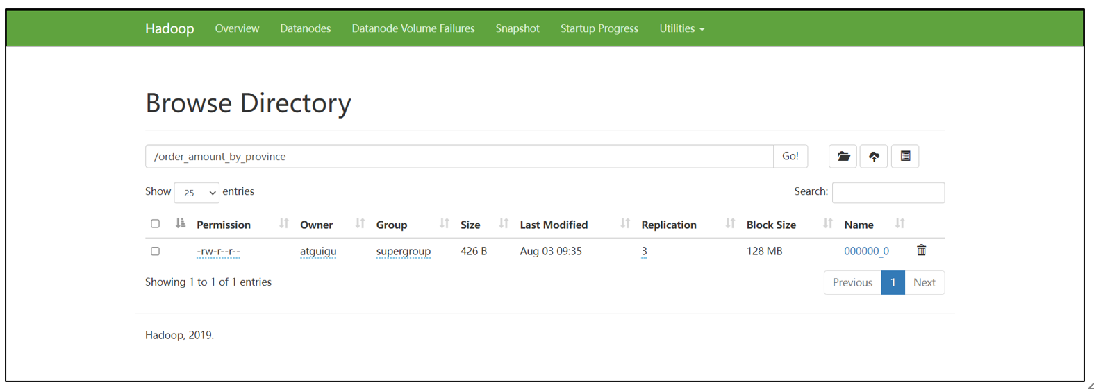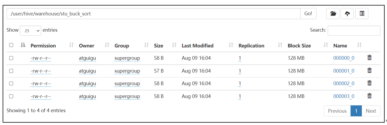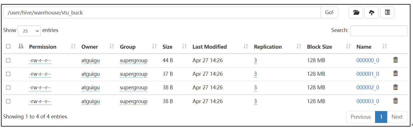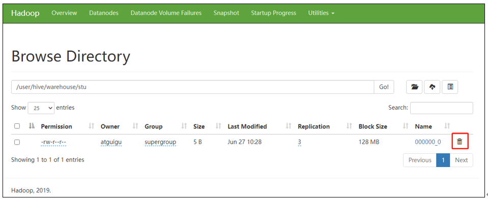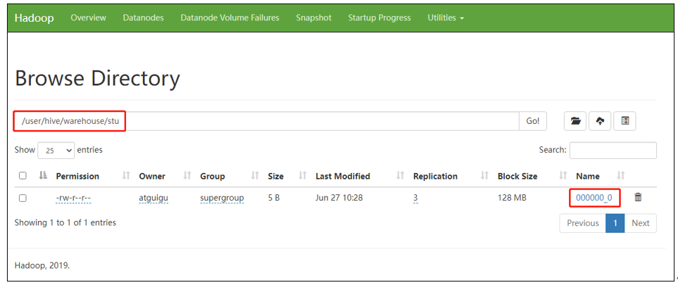 hive> select * from stu;观察HDFS的路径/user/hive/warehouse/stu,体会Hive与Hadoop之间的关系:Hive中的表在Hadoop中是目录;Hive中的数据在Hadoop中是文件。