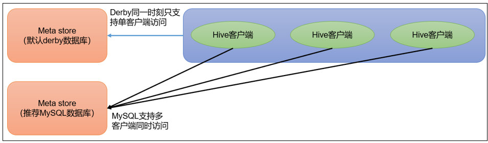 Source)原因在于Hive默认使用的元数据库为derby。derby数据库的特点是同一时间只允许一个客户端访问。如果多个Hive客户端同时访问,就会报错。由于在企业开发中,都是多人协作开发,需要多客户端同时访问Hive,怎么解决呢?我们可以将Hive的元数据改为用MySQL存储,MySQL支持多客户端同时访问。
