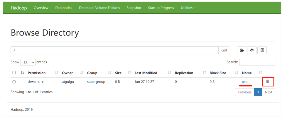 $ hadoop fs -rm -r /user删除HDFS中/user/hive/warehouse/stu中数据。