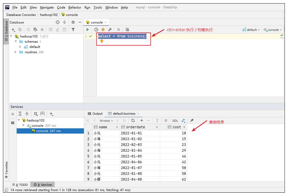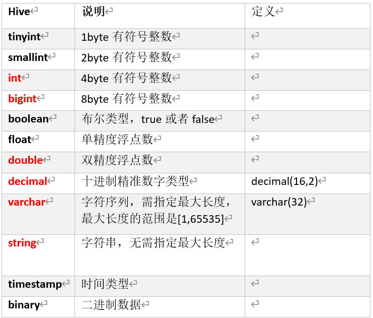 - 元数据包括:数据库(默认是default)、表名、表的拥有者、列/分区字段、表的类型(是否是外部表)、表的数据所在目录等。