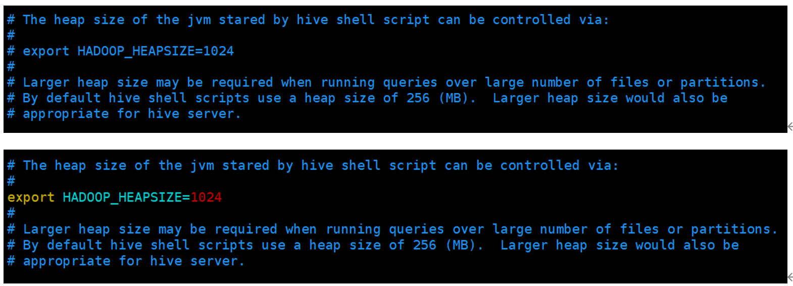 $ cp hive-env.sh.template hive-env.sh然后将其中的参数export HADOOP_HEAPSIZE=1024的注释放开,然后重启Hive。