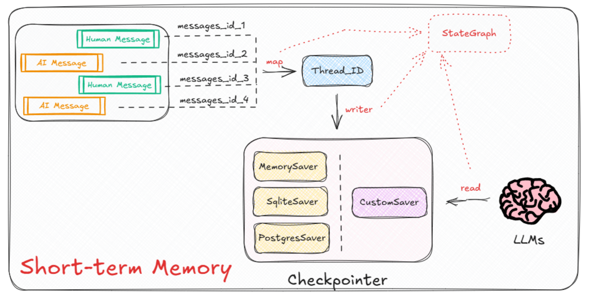 因此,无论是想在已有的图中加入短期记忆还是长期记忆,理解它们管理模式的具体实现方法就是我们学习的关键。首先,让我们探讨用于管理短期记忆的Checkpointer。