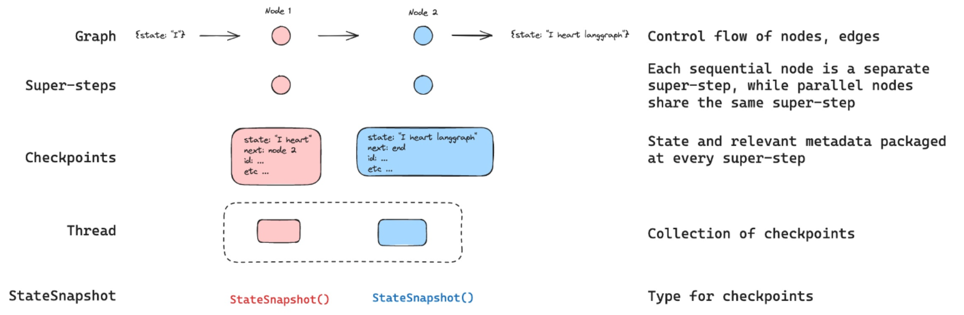 LangGraph 框架有一个内置的持久层,通过checkpointer实现。当使用checkpointer编译图时,检查点会在每个超级步骤中保存图状态的checkpoint。这些checkpoint被保存到一个thread中,可以在图执行后访问。如下图所示: