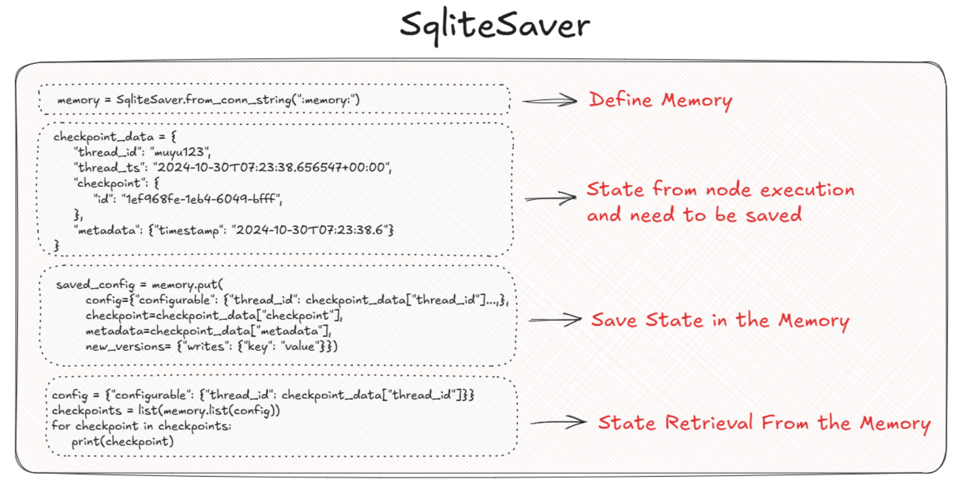 接下来,我们以 MemorySaver 这个实现checkpointer的方法为例,帮助大家理解这个过程。