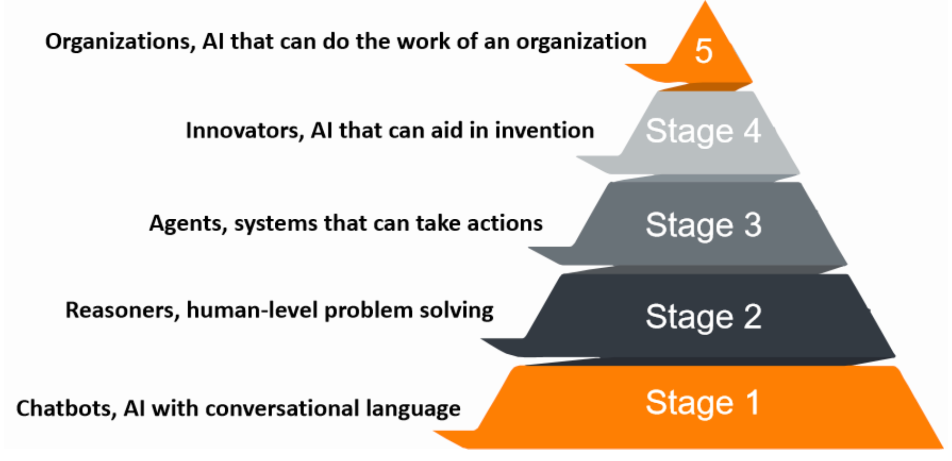 在 OpenAI 提出的人工智能的最后阶段:AI 系统将变得足够先进和智能,可以完成整个组织的工作,并将组织归类为智能路线图的最后一步。