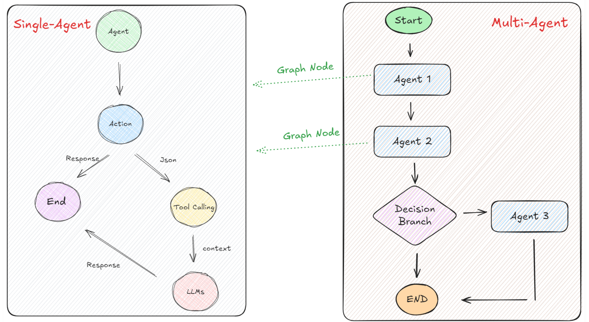 在多代理架构中,对于子代理的数量以及应如何连接它们时,没有严格的规则或准则,可以完全依赖开发者的思路和实际的业务场景进行自定义编排。我们要做的是:在功能设计上将较大的目标分解为较小的任务,并创建单独的代理来处理这些任务中的每一个。每个代理都拥有自己的系统提示和身份设定、大模型的接入支持、工具和自定义代码,从而形成多智能实体的协作交互。