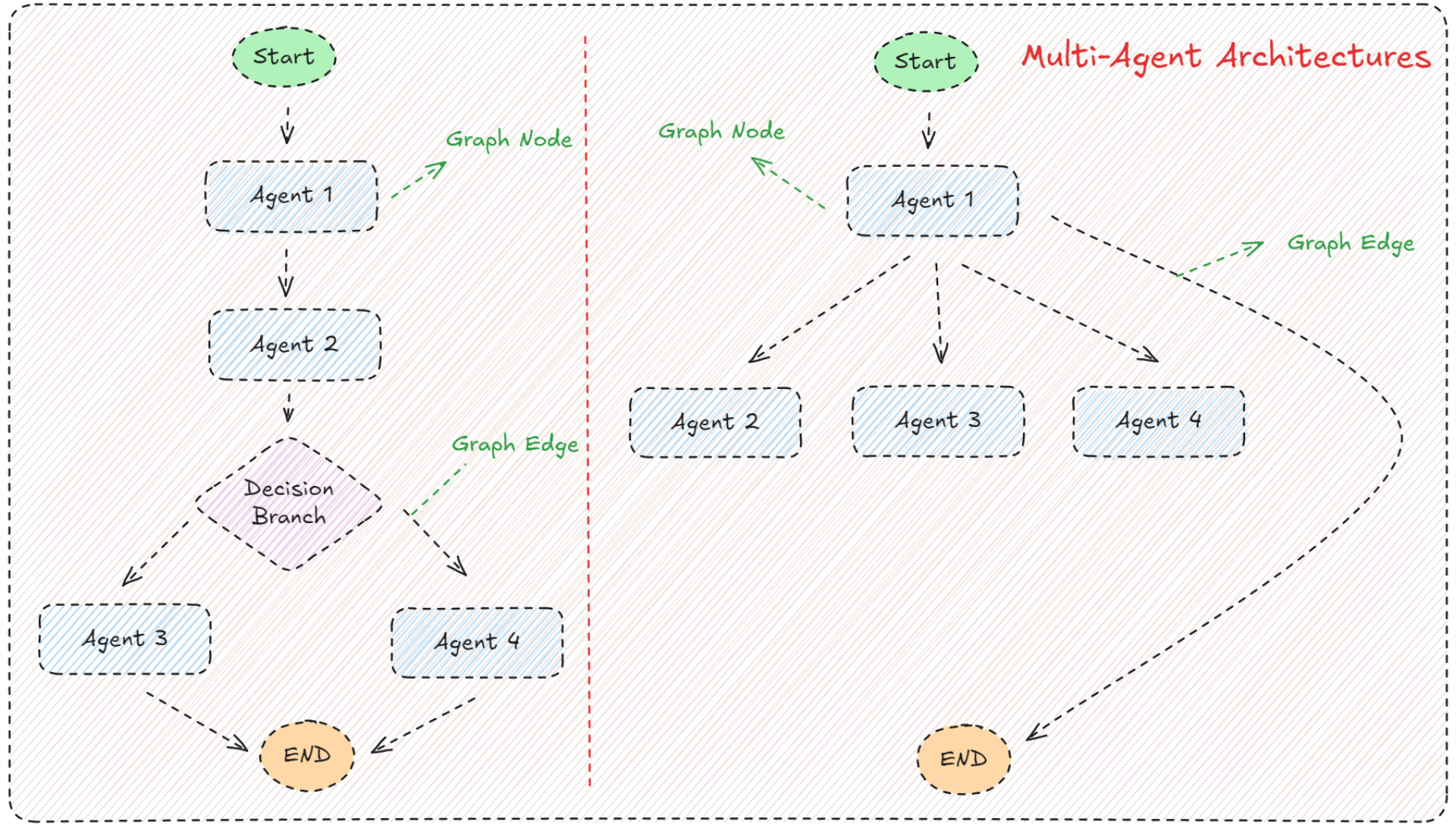 唯一还欠缺的知识点只有:如何去建立起不同Agent之间的通信连接。在Single-Agent架构中,我们是通过节点和边去构建图的结构,但在Multi-Agent,当简单的节点由复杂的Agent来替代,那么如何去建立起不同Agent之间的通信关系,就是我们在构建多代理系统时唯一需要关注的事情。如下图所示 👇