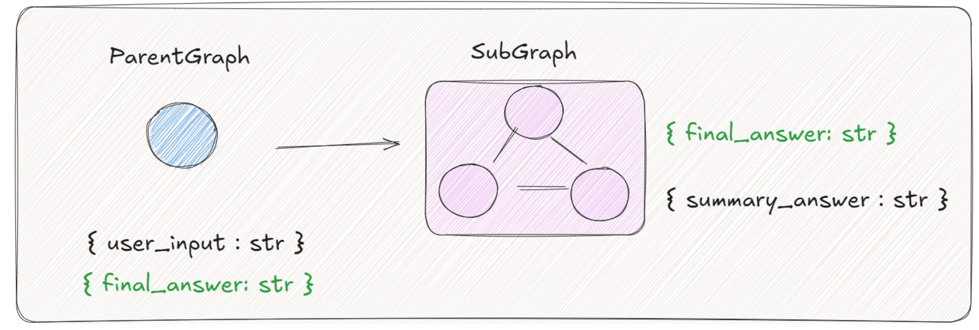 如果父图与子图是完全不同的架构,则会出现上图中无共同键可用的情况。在这种情况下如果仍然想让父图与子图之间能够以某种方式进行通信,则需要定义一个调用子图的 node 函数,其作用是:在调用子图之前将输入(父)状态转换为子图状态,并在从节点返回状态更新之前将结果转换回父状态。 我们来看下面这个案例: