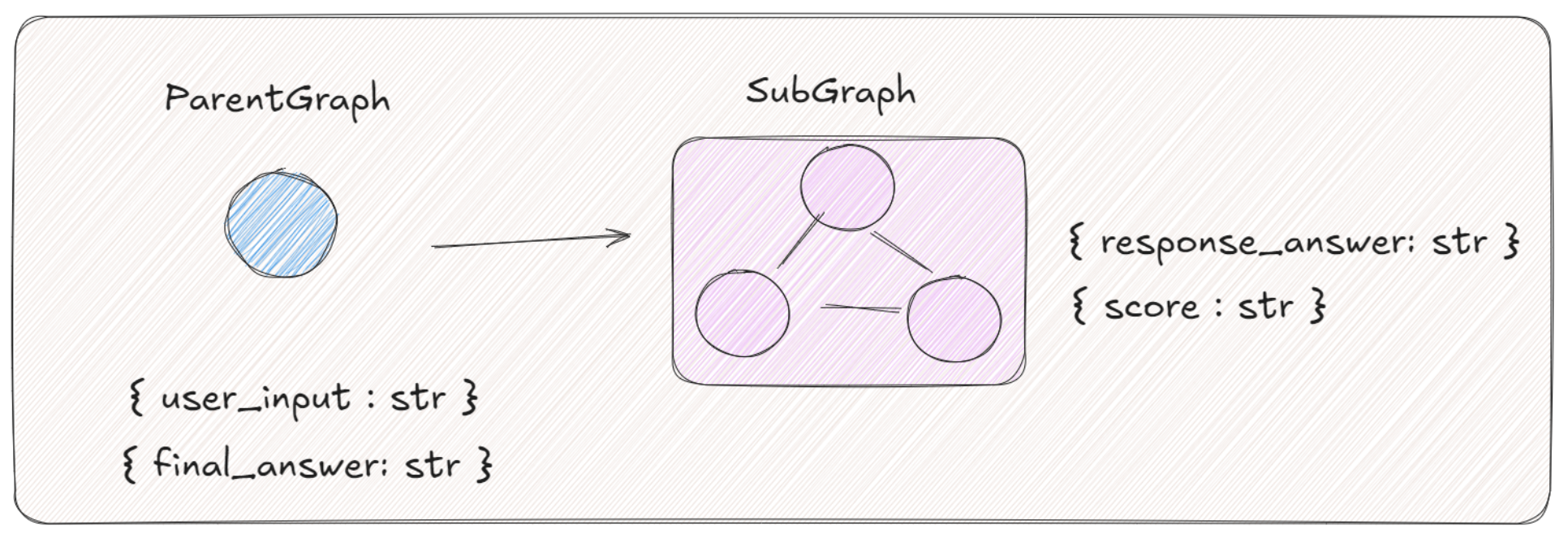 对于子图来说,父图生成的响应会传递到子图,子图的第一个节点负责将这个响应缩减为一个简洁的总结。然后在子图的第二个节点,对完整的响应及其总结进行评分。因此涉及的状态模式就如下图所示: